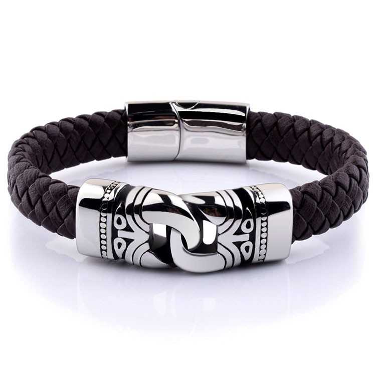 Bracelet Cuir Noir Tressé et Acier 316L Homme et Femme Perles d' Agate Wheatering
