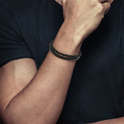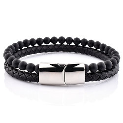 Bracelet Cuir Perles d'Onyx Homme et Femme Multi-rangs Acier 316L