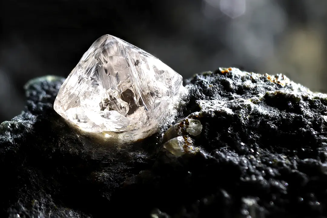 Le diamant est formé il y a trois milliards d'années sous d'énormes pressions, à des profondeurs de 150 km. Les diamants sont expulsés par des éruptions volcaniques, puis remontés par des cheminées à la surface de la Terre. Ils se retrouvent ainsi piégés dans des roches volcaniques appelées Kimberlites.