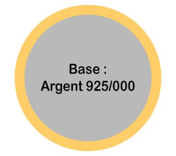 - Le Vermeil : la couche d’Or représente au moins 2,5 microns d’épaisseur appliquée sur une base en Argent.
